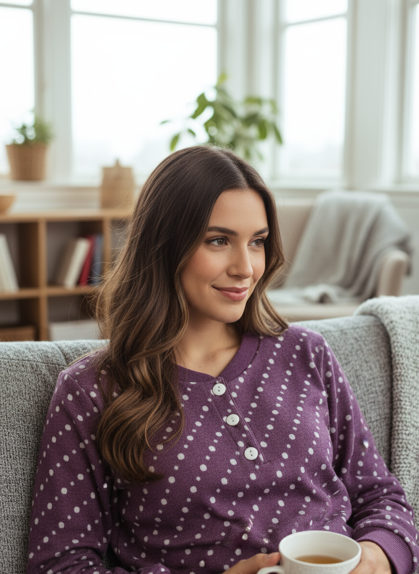 Pigiama donna in cotone interlock di qualità superiore, progettato per garantire il massimo comfort durante il riposo notturno. Il tessuto morbido e traspirante mantiene la giusta temperatura corporea, mentre la vestibilità rilassata permette libertà di movimento. La composizione in puro cotone assicura morbidezza duratura e facilità di lavaggio. Ideale per chi ricerca un pigiama che coniughi praticità e benessere, perfetto per le serate autunnali e invernali. Pantalone tinta unita.