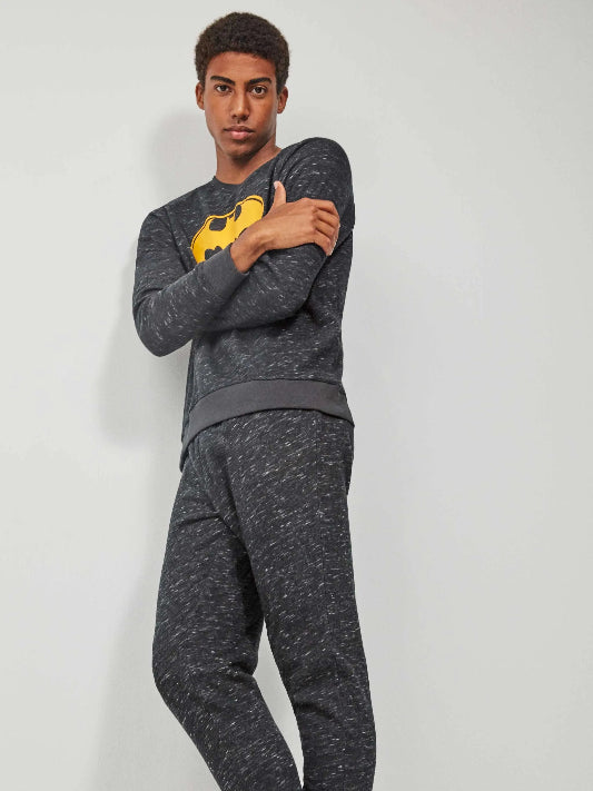 Pigiama da uomo di Batman in flanella felpata con maglia a maniche lunghe con print logo centrale e pantaloni a contrasto regolabili in vita con elastico e laccio.